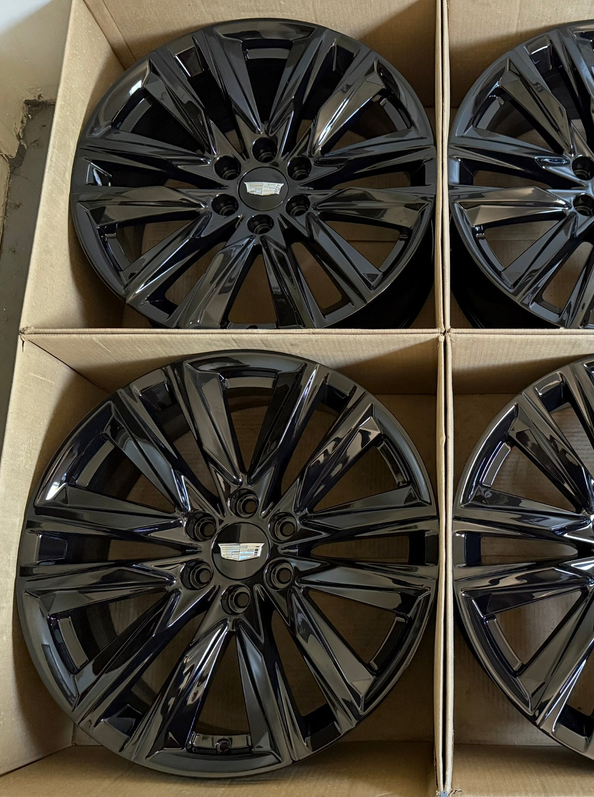 A squared set of (4) 22" Cadillac Escalade Factory OEM Wheels in Gloss Black Powder Coat Finish